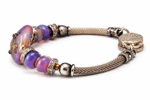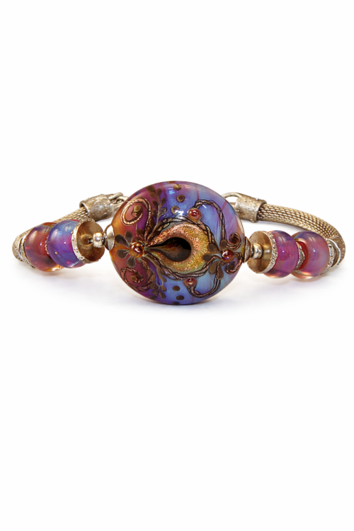 A graceful procession of dainty comets progress in a gentle rhythm along the edge of a shimmering silvered moon. The Comets on Parade Lampwork Pendant has a soothing combination of colors and textures in silvered dichroic, opalescent aqua, and shimmering creams against a backdrop of deep cobalt. The bead is hand wrapped in sterling silver wire and accented with mystic blue topaz rondelles. The pendant is 2.75″ long x 1.75″ wide with a handmade slider bail hole of 6mm wide x 8mm. The focal is numbered (2) and signed with the artist’s initials on the back.