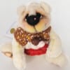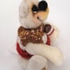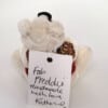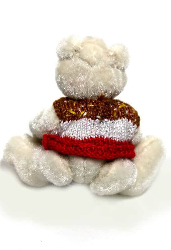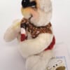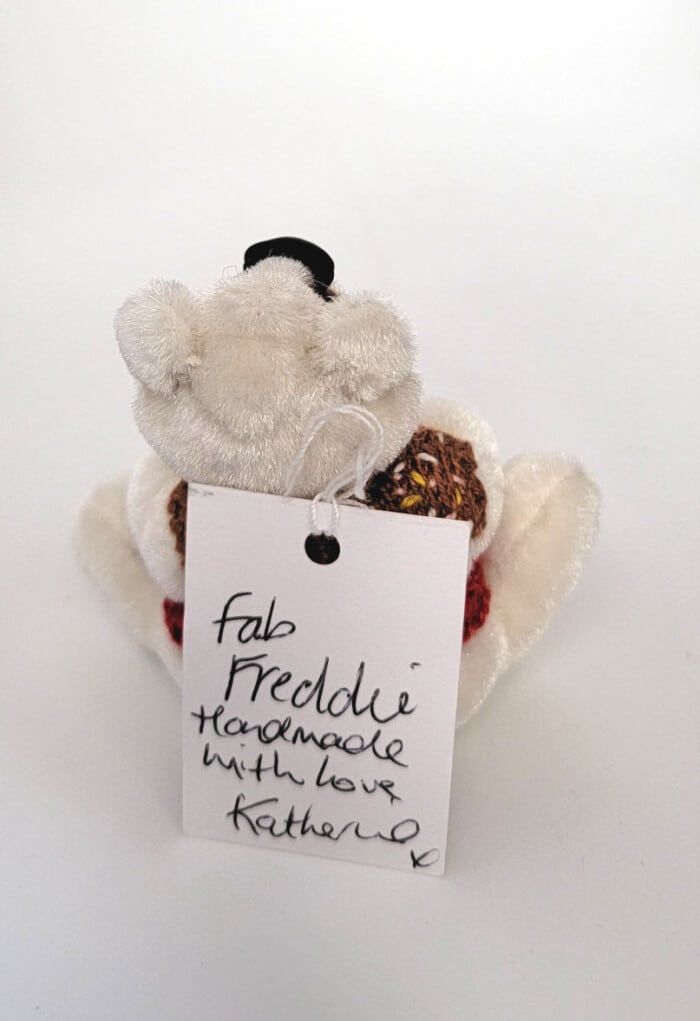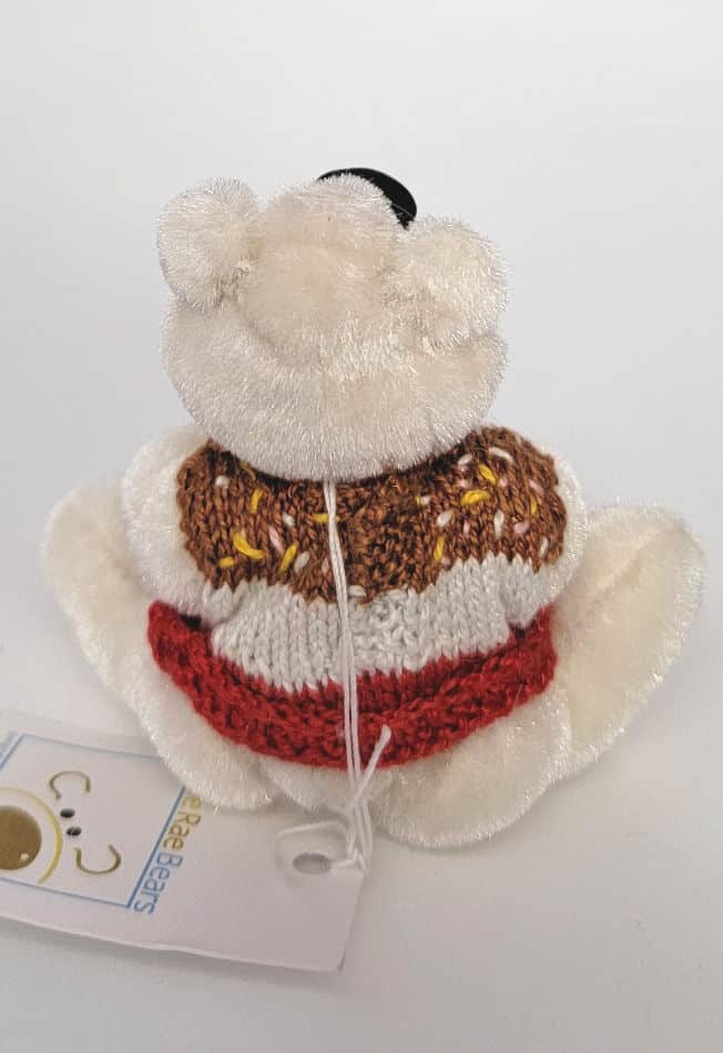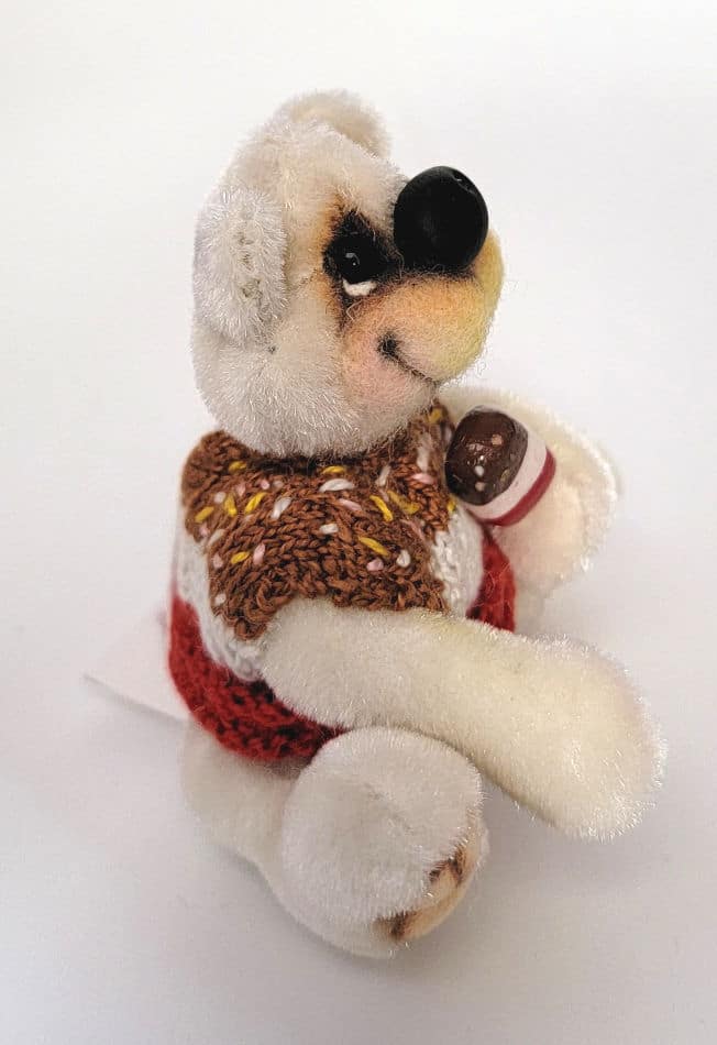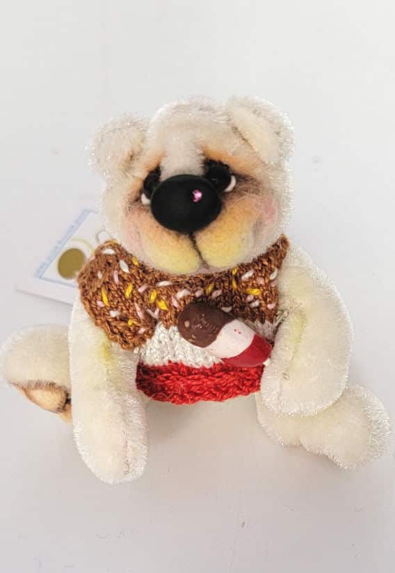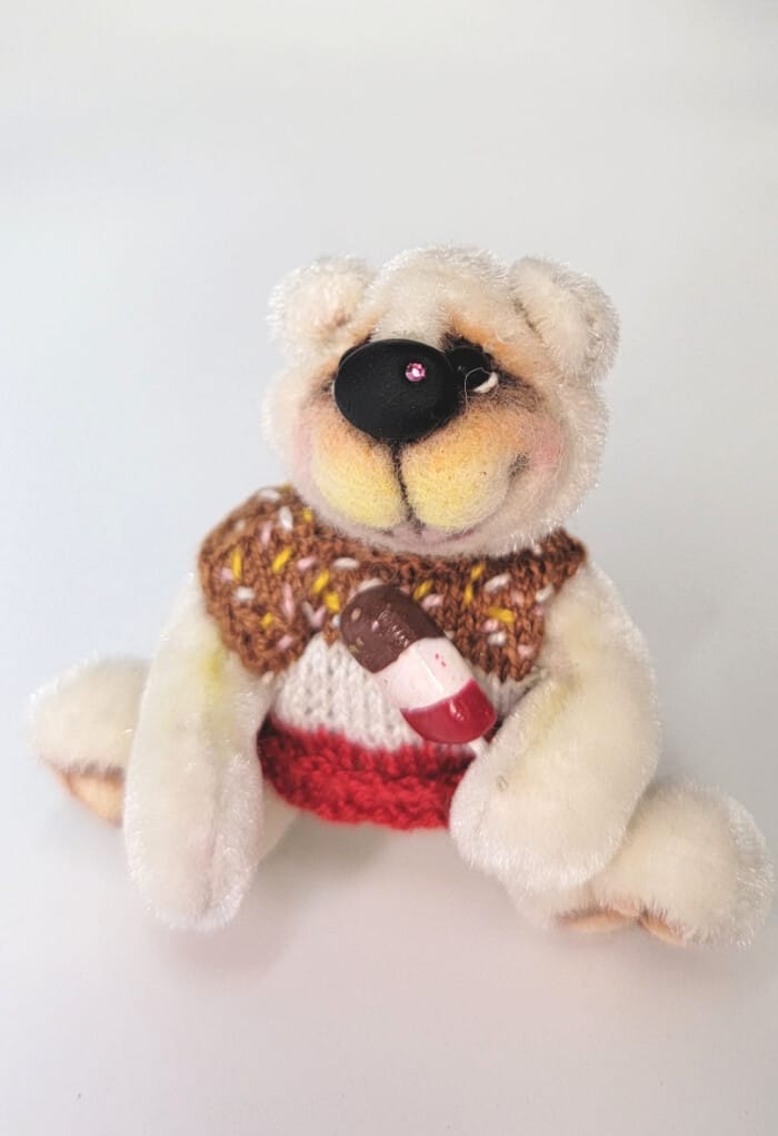Fab Freddie is a miniature Katie Rae Bear, measuring about 4″” tall. He is made from cream colored mohair. His face has black, yellow and pink airbrushing and his black nose has a raspberry colored rhinestone in it, the hallmark of a Katie Rae Bear. Fab Freddie wears a handknit sweater of cream, red and brown mixed with pink, cream and yellow threads at the top. In his left paw he holds an ice cream popsicle in flavors of chocolate, vanilla and strawberry topped with sprinkles. He has black glass eyes and his legs and arms are jointed, so he can be posed.