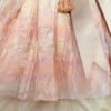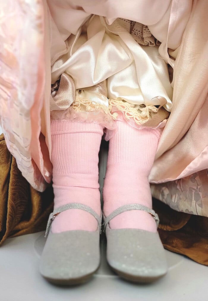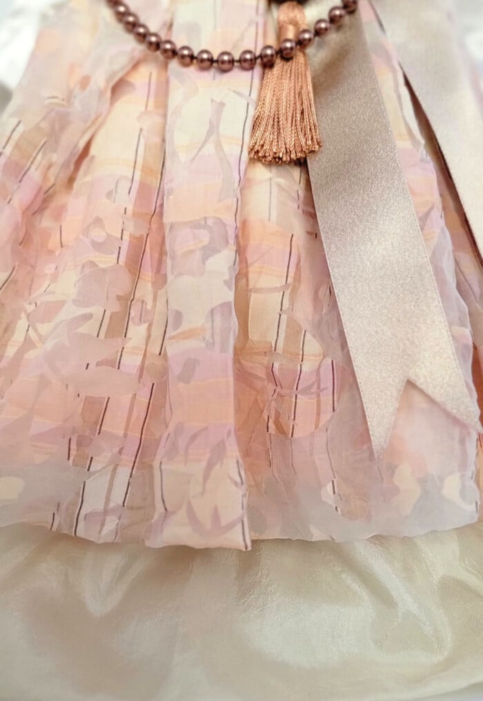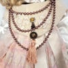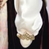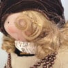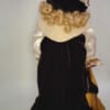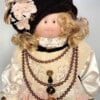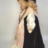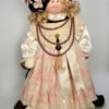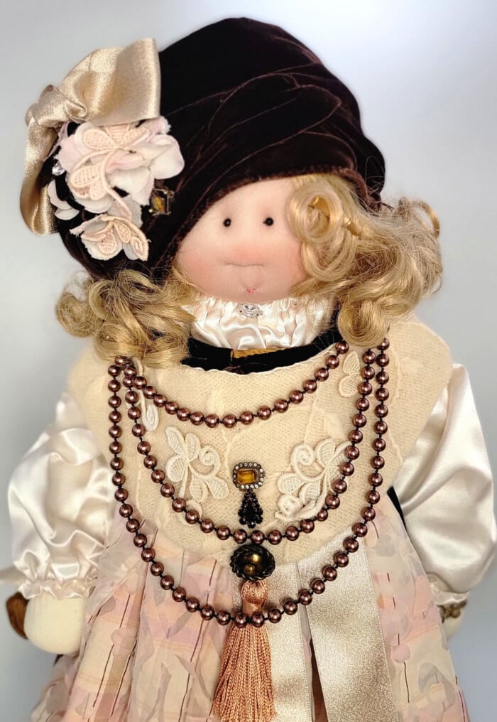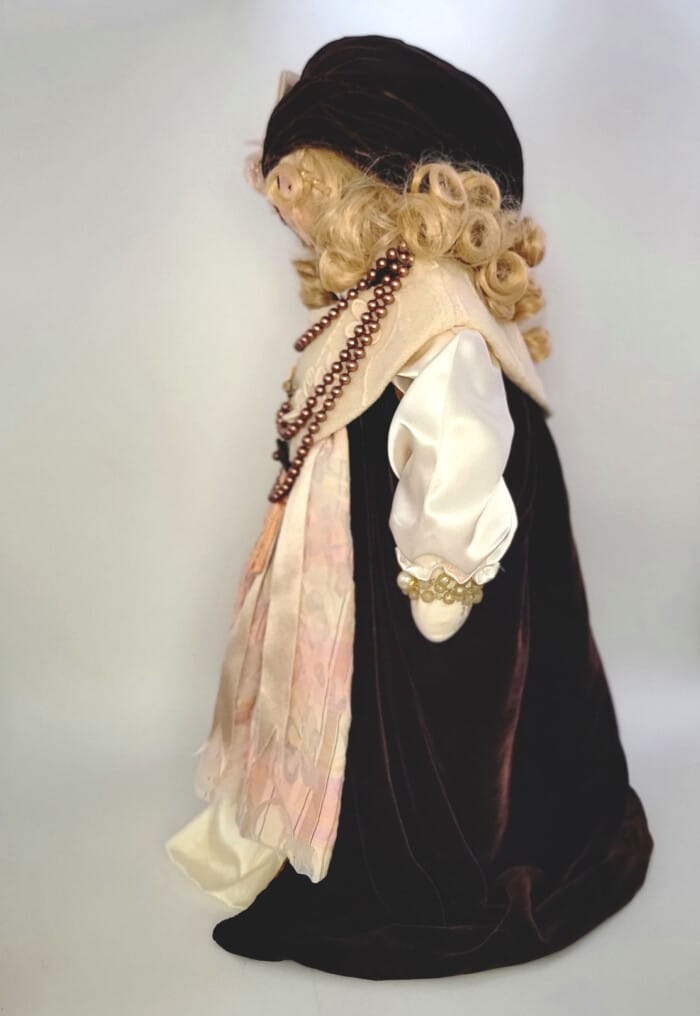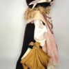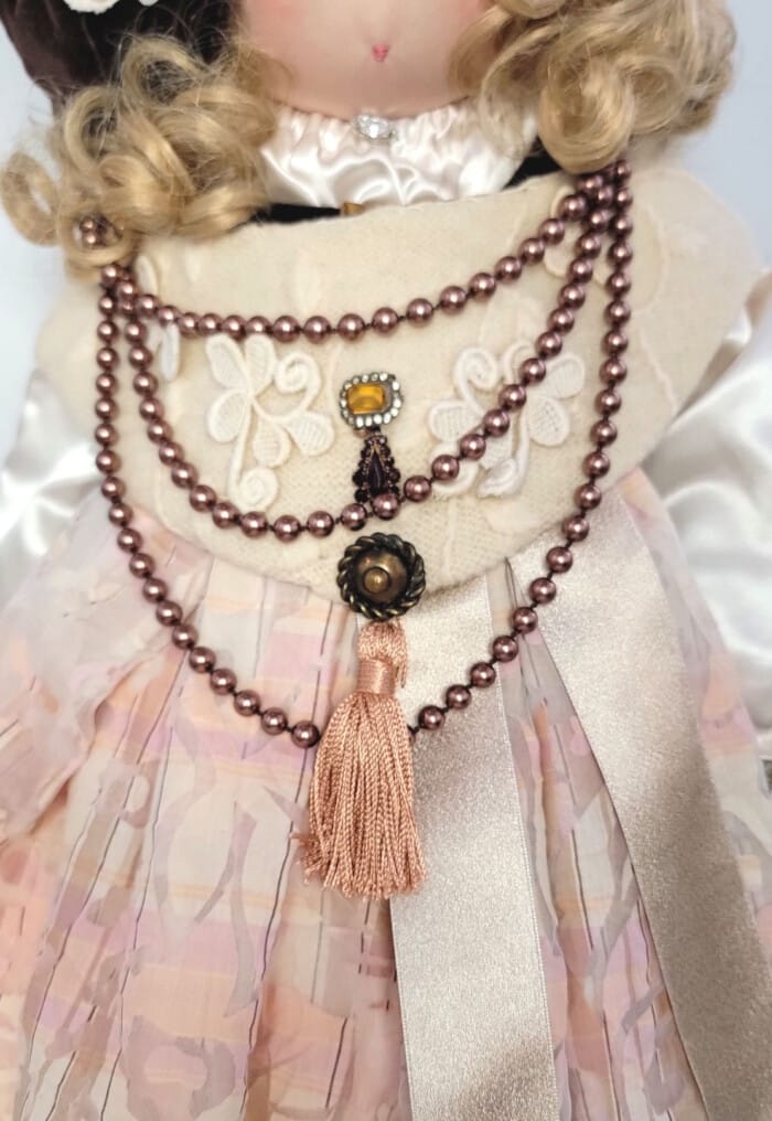 Fancy Firth is a 24″ Little Souls Swanky Doll dressed in layers of beautiful fabrics, trims, beads and lots of vintage touches. Her dress of light cream silk is covered with three skirts. The bottom skirt is made from a light cream silk. That is overlayed with a solid light peach silk and it is topped with a soft semi-sheer skirt in tones of light peach, light pink, cream, brown and tan. All of the skirts are self-lined to create a nice volume. Beneath her skirt are light cream silk bloomers that are finised with beige trim and pink socks with ruffles under sparkly silver mary janes. She wears a cloak of dark brown velvet lined with tone on tone gold paisley printed silk. Her cloak is held in place by beige ribbon that flows down to the left side of her outfit. On top of the cape is a large vintage off-white woven wool collar with embroidered floral design decorated with off-white woven trim, a vintage gold, red and rhinestone pin, and a light peach tassell dangling from a vintage gold button .