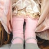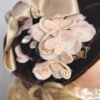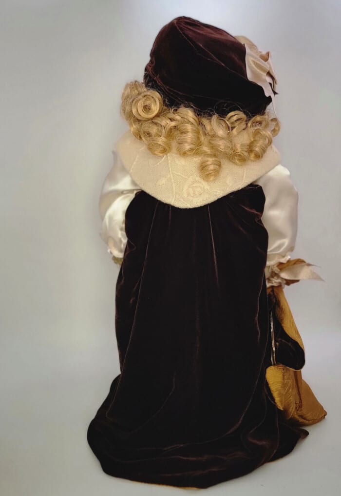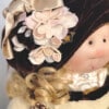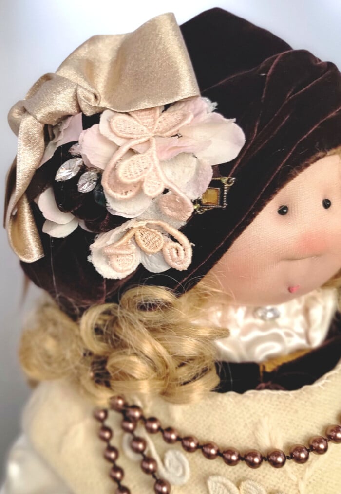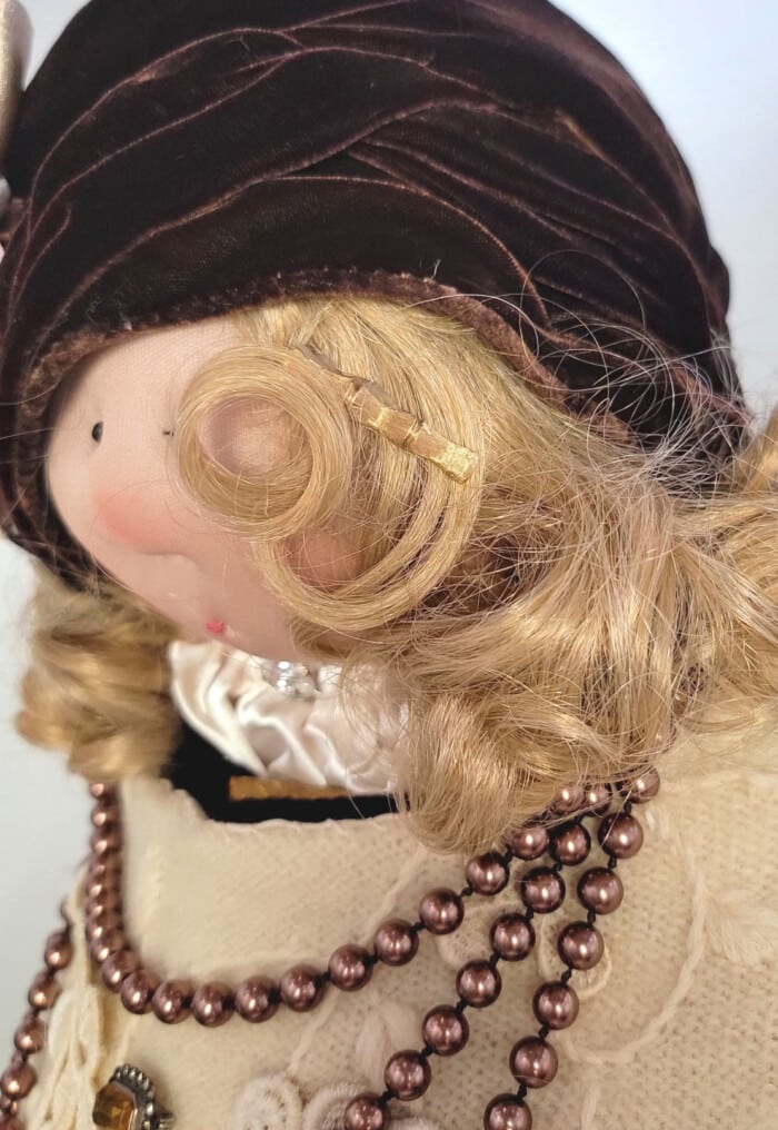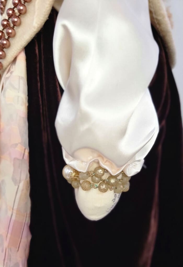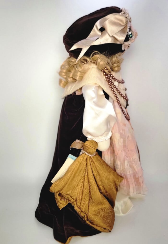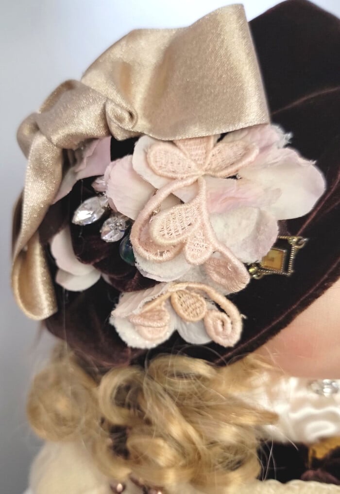 A lovely brown velvet hat covers Fancy’s loose blonde curls that are held by a vintage gold barrette in her hair. The hat is decorated with a beigh satin bow, pale pink flower petals, off-white woven trim, three large diamond shaped vintage rhinestones, a vintage green glass bead, a gold circle with rhinestones and a vintage green and gold drop earring. At her neckline is another large diamond shaped rhinestone broch and she wears a vintage pearl and silver bracelet on her left wrist. Her outfit is beautifully accessorized with a handmade bag made from the materials used for the cloak filled with some vintage photos and other goodies and a double stand of light bronze faux pearls around her neck. Fancy certainly lives up to her name and is a gorgeous Swanky Little Souls Doll.