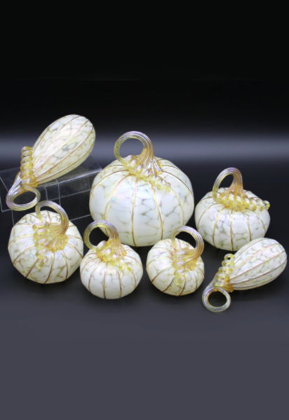 All pumpkins and gourds are blown glass made one at a time by the artist. You can choose the options that you desire. Items that are not in stock can be ordered for delivery in one to two weeks.