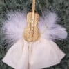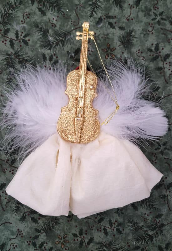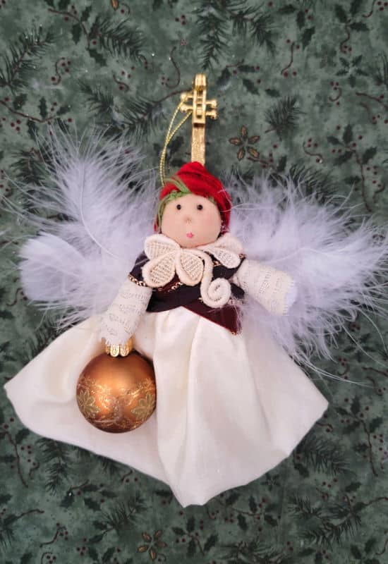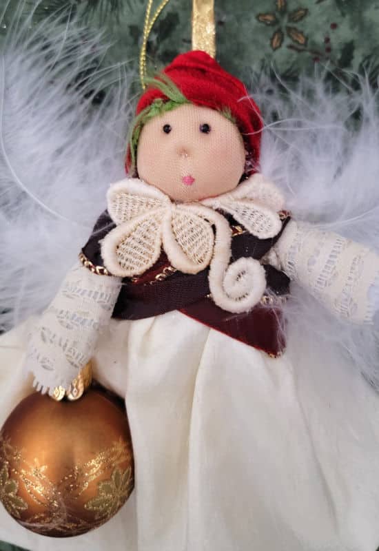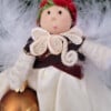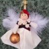 This Little Souls Angel Ornament is 7″ tall. Her skirt is made from light cream silk and is decorated with red velvet ribbon and topped with ivory lace. Her arms are wrapped in ivory lace and her red velvet cap is trimmed in red satin ribbon at the top. White wispy wings are held in place on her back by a glittery gold violin with a gold string attached for hanging.