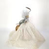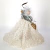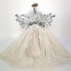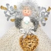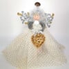 This 11″ one-of-a-kind Little Souls Tree topper is all dressed up for the holidays, complete with gold and silver wings and white and gold dotted swiss gown. In her hands is a golden heart tied with a silver bow. At her neckline is a mirrored circle and a pale green crystal. Her silvery hair is decorated with strings of silver beads and her halo is made from a vintage spoon. This tree topper is designed and handmade by Gretchen and arrives with a gold seal certificate of authenticity.