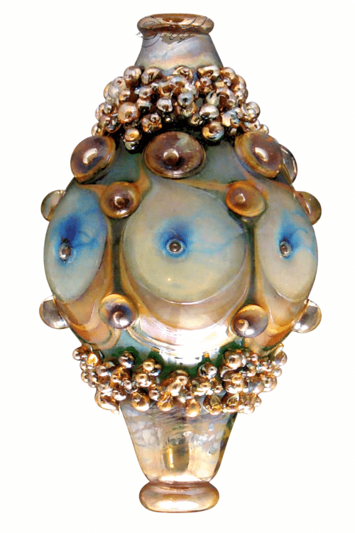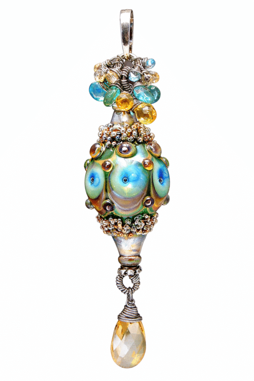 This beautiful handmade bracelet from Lydia Muell features the a bead from her “Plutonic Love” series. The handmade focal bead has a jet black base, with surface lenses that range in tone from pale golden yellow to fiery orange, with amber purple motifs and coppery gold dichroic layers, all accented by black and gold twisted cane. It features a flower that ranges in tones of striated deep garnet.