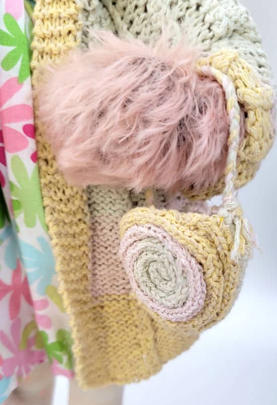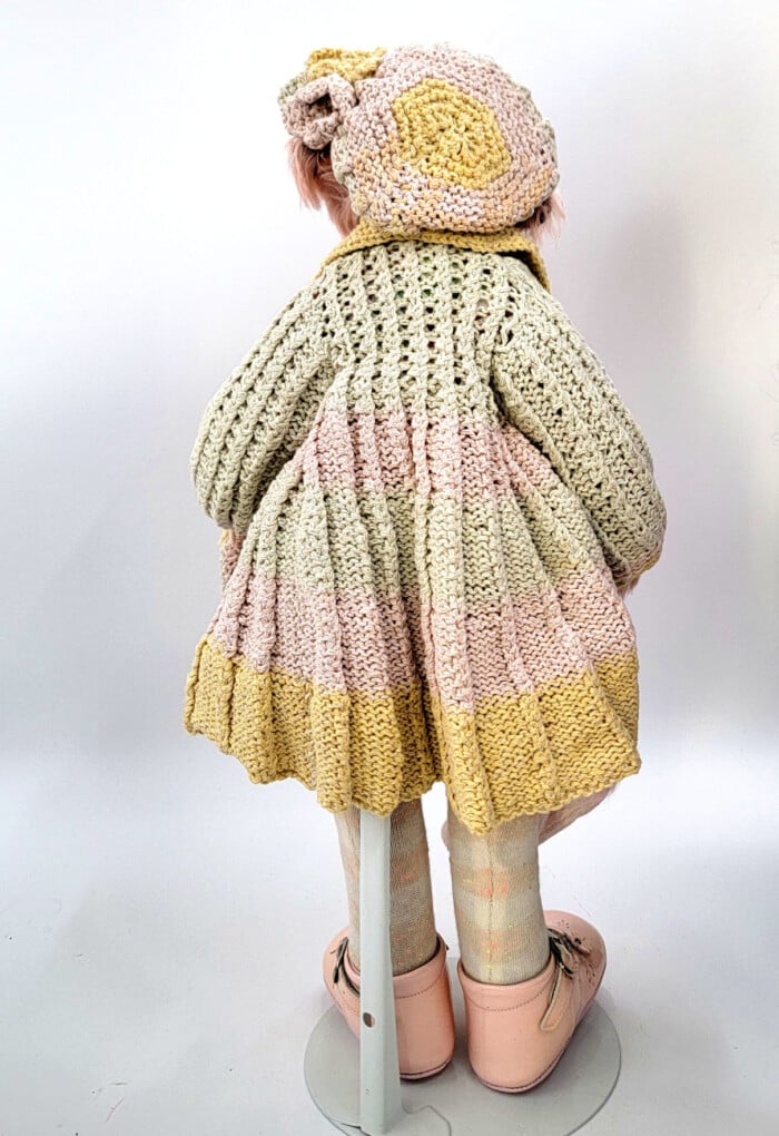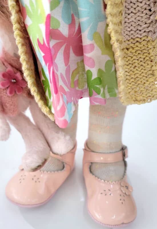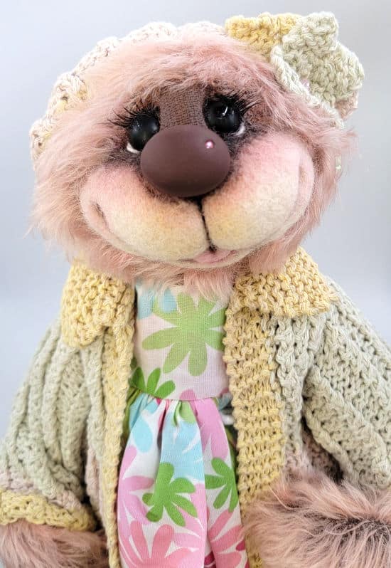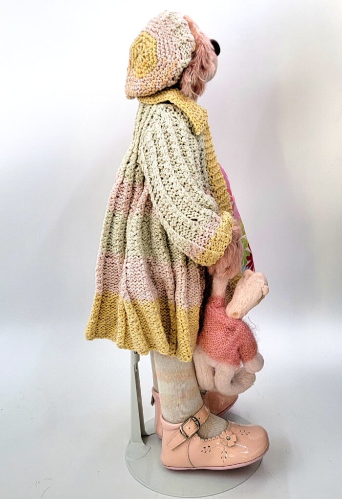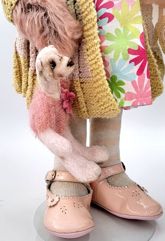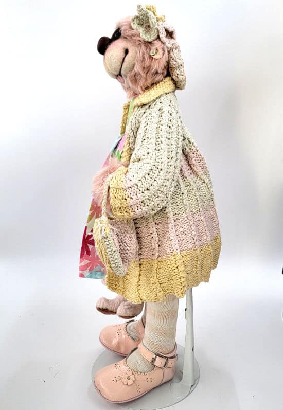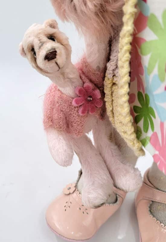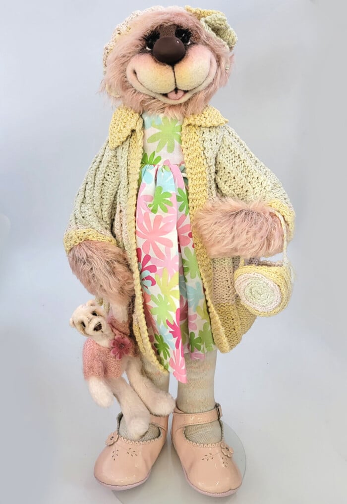 Sally Katie Rae Bear is 18″ tall mohair bear and handmade by Toby Award Winning bear artist Katherine Hallam. She is dressed in a hand made cotton flower printed dress, hand knitted coat and hat with knitted flowers, striped stockings and French designer leather baby shoes. She is holding a 6 inch vintage style Katies Attic Collection pink bear with hand knitted mohair jacket and felt flower, she has a little knitted bag with a surprise inside! Her brown nose is accented with a pink rhinestone, the mark of a Katie Rae Bear. Each bear arrives with a signed and dated tag of authenticity.