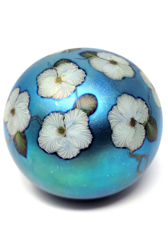 This beautiful hand blown glass paperweight is from Lundberg Studios’ master artisan Daniel Salazar. It is 3″ in diameter and 2.75″ tall. It features white apple blossoms with green leaves and brownish stems. The colors shift from a turquoise to true blue. It would make a beautiful decorative addition to any space.